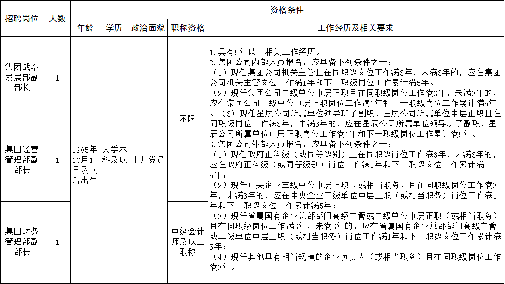 現(xiàn)根據(jù)工作需要,經(jīng)研究,面向集團(tuán)公司內(nèi)外部公開(kāi)招聘集團(tuán)公司機(jī)關(guān)部門副職3名。現(xiàn)將有關(guān)事項(xiàng)公告如下:
